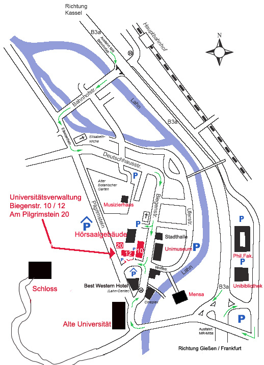 Sie verlassen die Stadtautobahn an der Ausfahrt Marburg-Mitte (Esso Tankstelle) und halten Sie sich ausschließlich rechts bis zur nächsten Ampel, an der Sie ebenfalls nach rechts in Richtung Innenstadt abbiegen. Dann geht es weiter auf der rechten Fahrspur nach drei Ampeln über die Lahn und hinter der Brücke biegen Sie an der nächsten Ampel nach rechts ab. Sie fahren am rechter Hand gelegenen Cineplex-Kino vorbei. Nach der übernächsten Fußgängerampel ist auf der linken Seite die Zentralverwaltung und danach die Einfahrt zu den Parkplätzen des Hörsaalgebäudes.